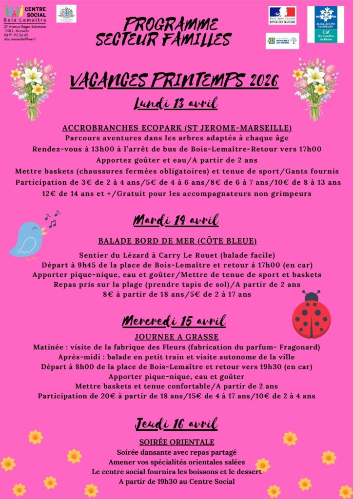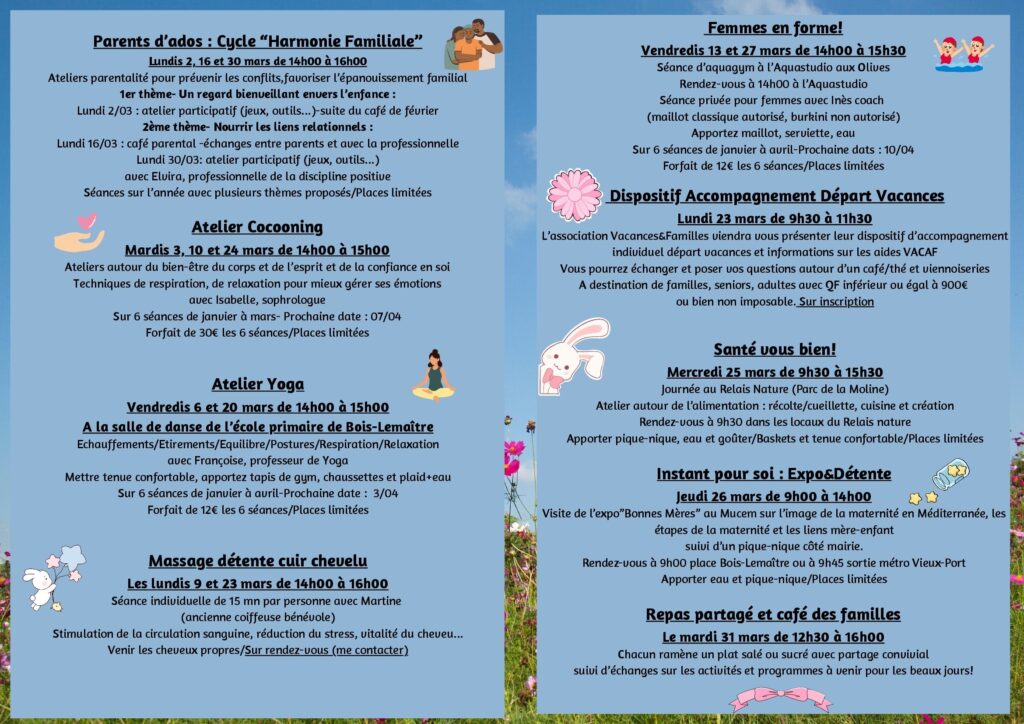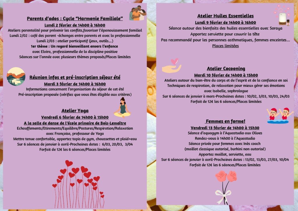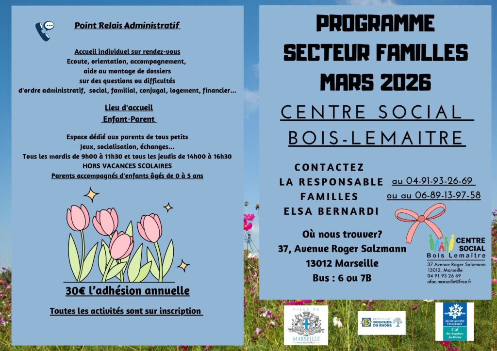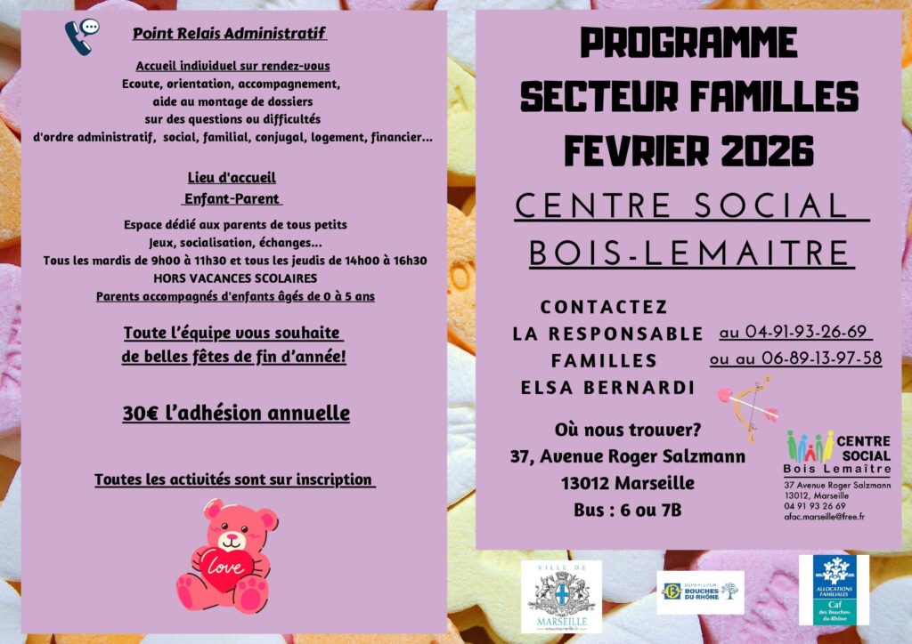 Le secteur Familles propose diverses activités conviviales autour du loisir, de la culture, de la parentalité et autres thèmes à destination des familles, des adultes et des seniors. Des projets bien-être, solidarité et temps forts sont pensés, construits ensemble, avec la volonté que les familles soient actrices des actions menées au sein du Secteur Familles. C’est un espace de partage, d’échanges et de création de liens, dans un esprit de vivre ensemble et de tolérance. La référente-familles, Elsa Bernardi, vous accueillera en vous proposant un programme d’activités riche et varié.