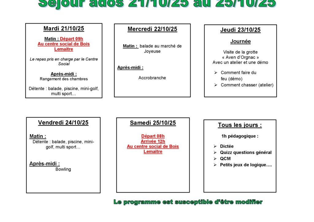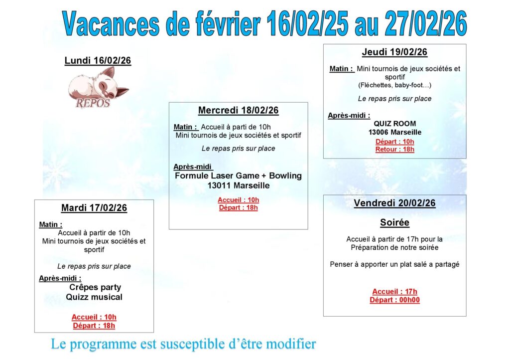 Le secteur Jeunes fonctionne pendant les vacances scolaires, mais aussi sur des temps spécifiques avec des actions les mercredis après-midis et les samedis. De 11 à 17 ans, vos ados sont accueillis tout au long de l’année. Une salle leur est dédiée avec une ouverture certains soirs. Des séjours sont organisés. Marion, la responsable Secteur Jeunes, se fera un plaisir d’accueillir vos ados.